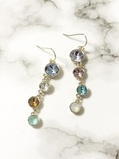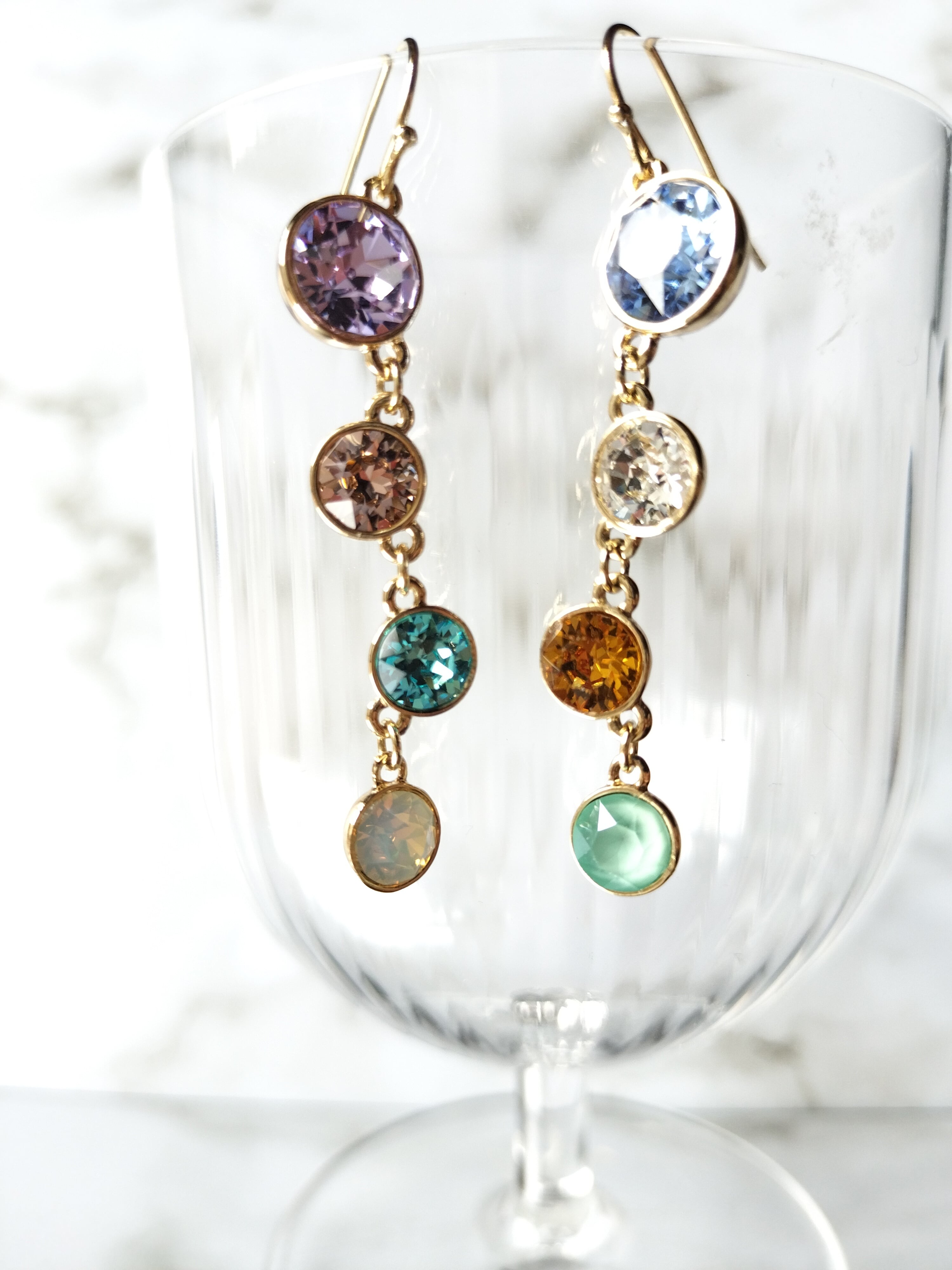 淡いカラーで統一した8色のクリスタルを動きが出るように互い違いにする事で華やかかつ、アクティブに見せてくれるので、お出かけから普段の装いにもマッチしてくれます。