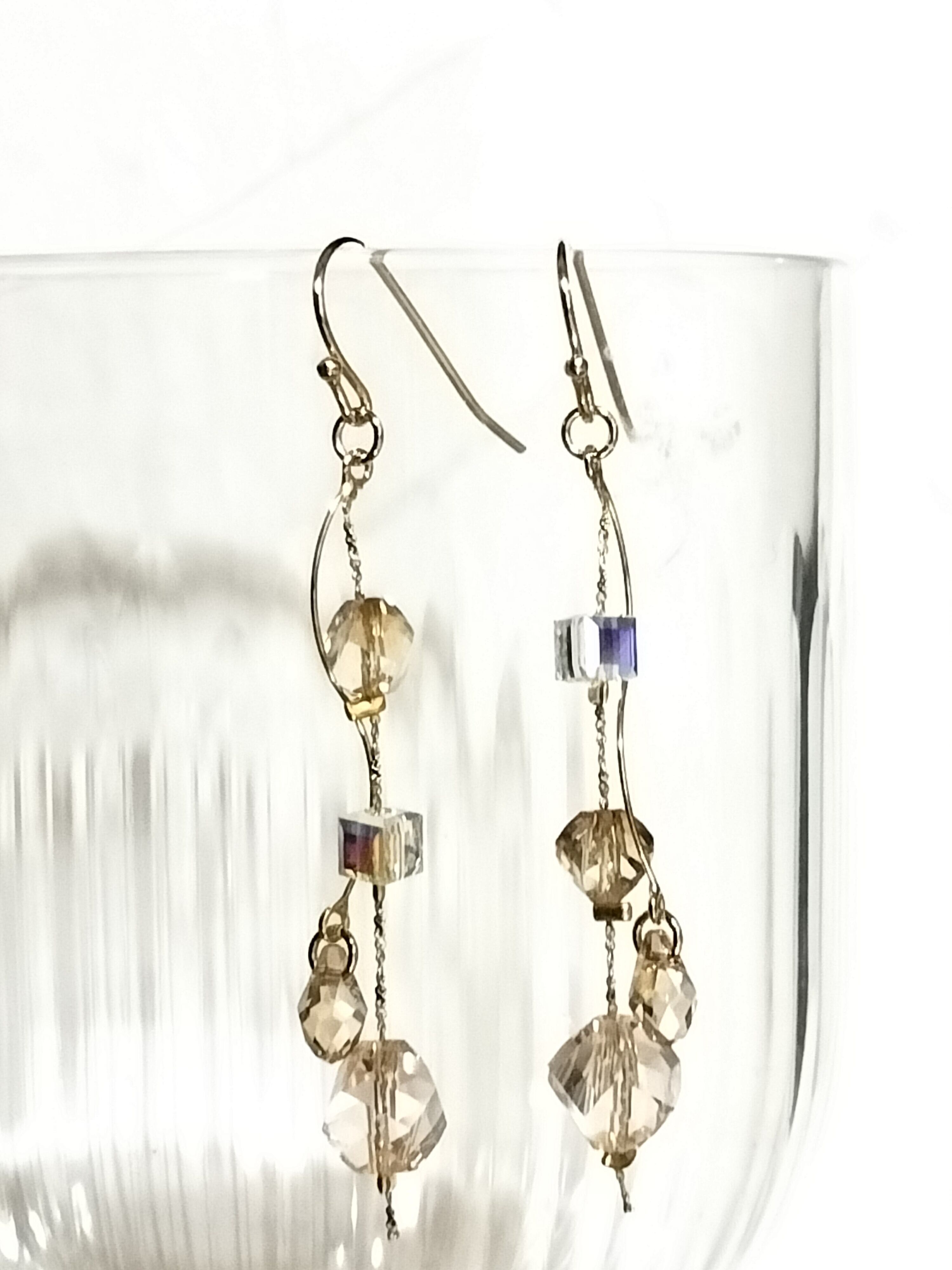 形や大きさの異なる小さなクリスタルを華奢な直線のチェーンと曲線バーに散りばめました。